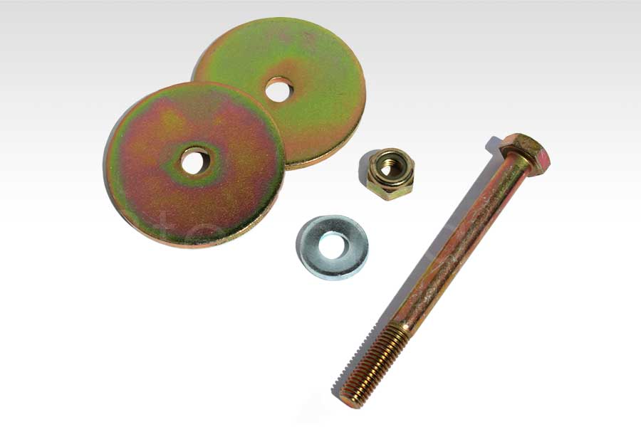 Includes one bolt, two large washers, one smaller diameter, thick washer and a lock nut